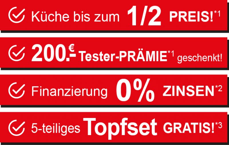 Das Einzige, was Sie bis 2 Wochen nach Lieferung Ihrer neuen Traumküche tun müssen, ist einen kurzen Fragebogen auszufüllen. Als Dankeschön erhalten Sie einzigartige Vorteile: Ihre neue Küche bis zum 1/2 Preis*1 , 200.- Euro Tester-Prämie*1 als Direktabzug vom Kaufpreis, auf Wunsch unsere kostenlose Finanzierungsmöglichkeit*2 und ein 5-teiliges Topfset im Wert von UVP# 129.- Euro gratis*3 dazu! Außerdem profitieren Sie als Tester zusätzlich von…