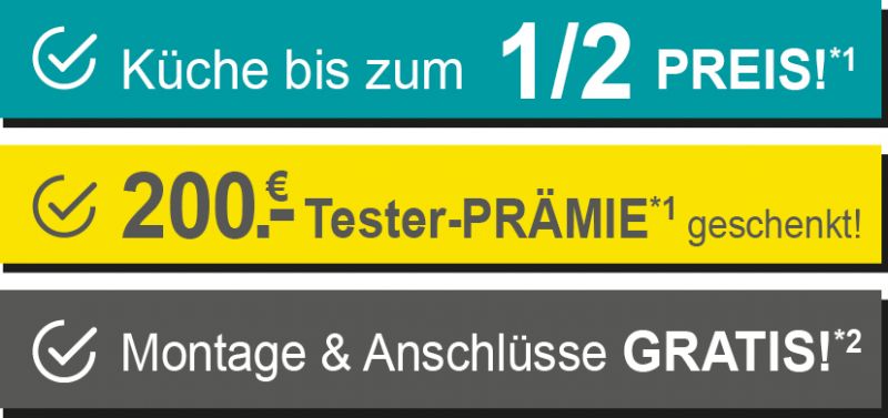 Das Einzige, was Sie bis 2 Wochen nach Lieferung Ihrer neuen Traumküche tun müssen, ist einen kurzen Fragebogen auszufüllen. Als Dankeschön erhalten Sie einzigartige Vorteile: Die Holzteile Ihrer neugeplanten Küche bis zum 1/2 Preis*1 günstiger, 200.- Euro*1 Tester-Prämie als Direktabzug vom Kaufpreis sowie die Montage Ihrer neuen Küche und die Strom- & Wasseranschlüsse an bestehende Leitungen gratis!*2 Außerdem profitieren Sie als Tester zusätzlich von…