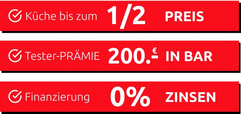 Das Einzige, was Sie bis 2 Wochen nach Lieferung Ihrer neuen Traumküche tun müssen, ist einen kurzen Fragebogen auszufüllen. Als Dankeschön erhalten Sie einzigartige Vorteile: Ihre neue Küche bis zum 1/2 Preis1), 200,- Euro Tester-Prämie in bar1) und auf Wunsch unsere kostenlose Finanzierungsmöglichkeit2). Außerdem profitieren Sie als Tester zusätzlich von…