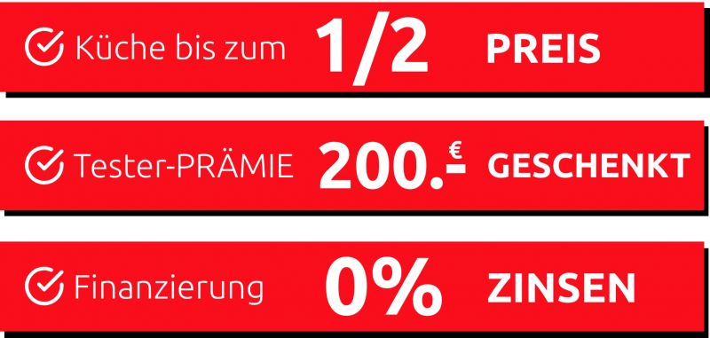 1) Neue Planungsküchen bis zum 1/2 Preis = 35% Sofort-Rabatt + 5% Sofort-Skonto bei 50% Anzahlung + 10% bei Selbstabholung. Gilt bei neu geplanten Küchen auf alle Holzteile und auf unsere Listenpreise. Nicht bei schon bestehenden Aufträgen, preisreduzierter, besonders gekennzeichneter Werbeware in unserer Ausstellung, Zubehör, Ersatzteilen sowie Serviceleistungen, Sonderbestellungen, Dienstleistungen und Artikeln der Firmen Team 7, Interliving und Ballerina. Nicht mit anderen Vorteilsaktionen kombinierbar. Tester-Prämie nicht in bar auszahlbar. Einmal pro Person und Kauf. 2) Barzahlungspreis entspricht dem Nettodarlehensbetrag sowie dem Gesamtbetrag. Effektiver Jahreszins und gebundener Sollzins entsprechen 0,00% p.a. Bonität vorausgesetzt. Partner ist die Targo Bank AG, Kasernenstr. 10, 40213 Düsseldorf. Die Angaben stellen zugleich das 2/3 Beispiel gemäß § 17 Abs. 4 PAngV dar. Unser Finanzierungs-Beispiel: Z.B.: Einbauküche, Barzahlungspreis: 4900,- €, Gebühren: 0,- €, Anzahlung: 0,- € = Nettodarlehensbetrag 4900,- €, monatliche Rate: 204,16 €, Laufzeit 24 Monate, Sollzins p.a.: 0,00%, eff. Jahreszins: 0,00%. Alles ganz einfach: Ab einem Einkaufswert von 500,- € übernehmen wir die Zinsen für Sie. In der Regel genügt die Vorlage von Personalausweis und EC-Karte. Gilt auf alle Neuaufträge, nicht bei schon bestehenden Aufträgen.