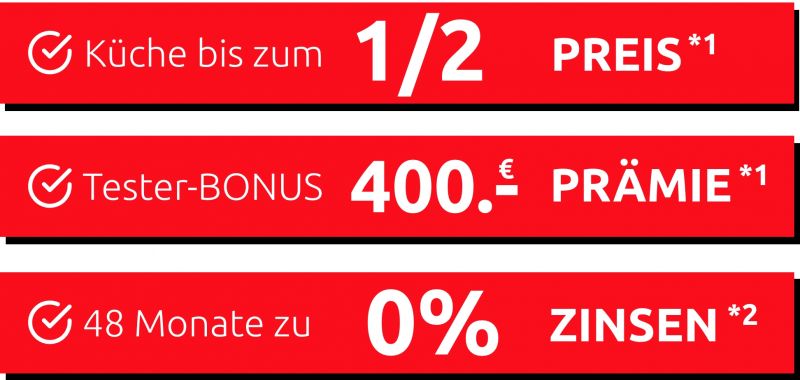 Das Einzige, was Sie bis 2 Wochen nach Lieferung Ihrer neuen Traumküche tun müssen, ist einen kurzen Fragebogen auszufüllen. Als Dankeschön erhalten Sie einzigartige Vorteile: Die Holzteile Ihrer neugeplanten Küche bis zum 1/2 Preis*1 günstiger und 400,- Euro Tester-Prämie in Form eines Einkaufs-Gutscheins*1 geschenkt. Außerdem profitieren Sie als Tester zusätzlich von…