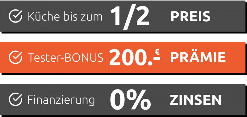 Das Einzige, was Sie bis 2 Wochen nach Lieferung Ihrer neuen Traumküche tun müssen, ist einen kurzen Fragebogen auszufüllen. Als Dankeschön erhalten Sie einzigartige Vorteile: Ihre neue Küche bis zum 1/2 Preis1), 200,- Euro Tester-Prämie direkt vom Küchen-Preis abgezogen1) und auf Wunsch unsere kostenlose Finanzierungsmöglichkeit mit bis zu 12 Monate zu 0% Zinsen2). Außerdem profitieren Sie als Tester zusätzlich von…